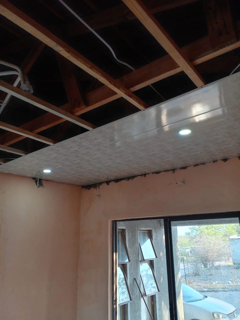 He’s using his newly acquired skills well, as seen in this photo of him installing a ceiling.